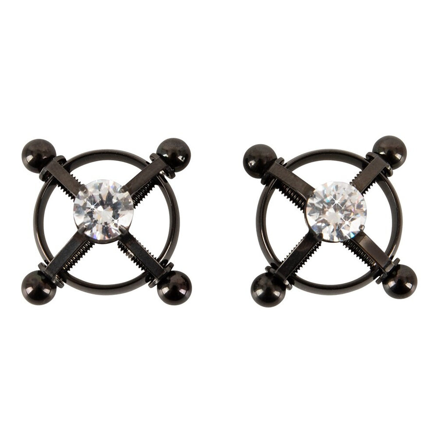 2 stainless steel nipple clamps with decorative gems With 4 adjustment screws each Lightweight 9 g per clamp Elegant piercing look Shiny, bittersweet nipple jewellery without piercing!