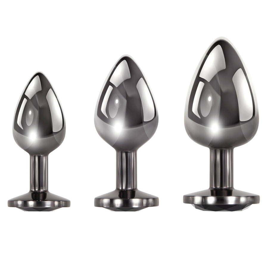 Indulge your back-door play with this dark metal anal plug set that opens up a world of pleasure! Experiment with small to large sizes to find the perfect sweet spot to boost the intensity of your orgasms. Then make sure you flash your booty to show off that sparkling black gem! Add an intensifying twist by heating or cooling your plugs beforehand for erotic sensation play. Clean with toy cleaner and hot water. Velvet drawstring bags are included for each plug. Sparkling black gem butt plug set Small, medium and large plugs Tapered tips for easy entry Great for beginner to advanced The slick and stylish gunmetal finish Sparkling black gem at safety base Includes black velvet drawstring bags for each plug Made from aluminum alloy Black gem made from ABS plastic Dimensions Small 2.81 x 1.08 x 1.08 inch. 7,1 x 2,7 x 2,7 cm Medium 3.25 x 1.35 x 1.35 inch. 8,2 x 3,4 x 3,4 cm Large 3.75 x 1.61 x 1.61 inch. 9,5 x 4,0 x 4,0 cm