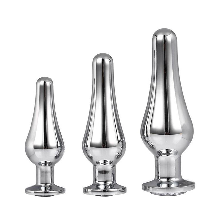The Gleaming Love collection presents this set of conical shaped and shiny anal plugs with a gemstone in the base. Made of smooth lightweight aluminium and seamless, these pleasure toys are easy to glide and the increasing size is guaranteed to induce pleasure. The flared base ensures a sense of security while keeping the jewel sitting comfortably between the butt cheeks.  The jewelled plugs are beautifully decorated with a delicate round gemstone. From tip to base the seamless anal plugs feature a glimmering sheen that pairs wonderfully with the sparkle of the matching gemstone. The tapered conical shape of the plugs combines ease of use with erotic backdoor pleasure. The Gleaming Love plugs can be heated or cooled in water before use to provide additional sensations.  A storage bag made of soft velvety fabric that closes with a drawstring is included.  Dimensions Small length 9,0 cm Small diameter 2,9 cm Medium length 11,0 cm Medium diameter 3,4 cm Large length 12,7 cm Large diameter 4,0 cm  Made from Aluminum