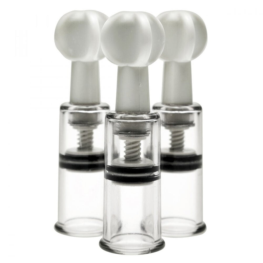 Enjoy powerful suction with this triple set of demurely sized suction cylinders. Just apply to any area that would benefit from increased sensitivity and blood flow, no pumps or accessories needed. These self contained suction devices work with a simple twist. Silent, simple, and discreet, these suckers can be taken and used practically anyway for on the go stimulation. Lubed internally for smooth movement and a strong seal that makes for sublimely powerful suction. Measurements Opening is 0.75 inches in diameter, tube is 2.35 long and entire item is 4 inches long
