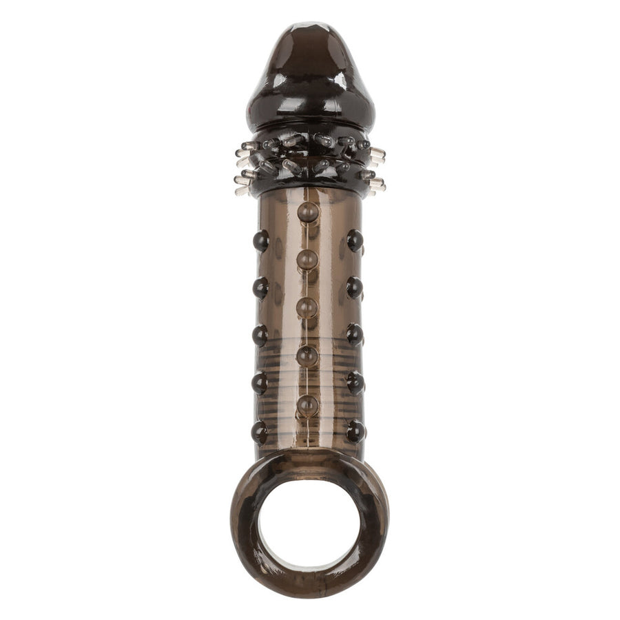 Indulge in you and your mutual satisfaction with the powerful Ultimate Extender male enhancer. While the closed-end sleeve suction and ribbed chamber thrill him, the added girth, thrilling studded texture and 2 inches of length will leave your lady shaking. The built-in scrotum strap and thick sleeve provided added erection support and increase stamina to prolong and intensify pleasure for any couple. Step up your pleasure and never settle for less when it comes to size, our super stretchy extender with supportive scrotum strap will have you and your lover craving more, more, more. Our super stretchy enhancer stretches to fit any size man. The Soft, stretchy TPE is unscented, phthalate-free and maintenance-free to keep your most sensitive spots, happy and healthy. Enjoy easy clean up with this maintenance-free stimulator sleeve, simply wash with soap and warm water before and after each use. Use ample lubricant for easy insertion.